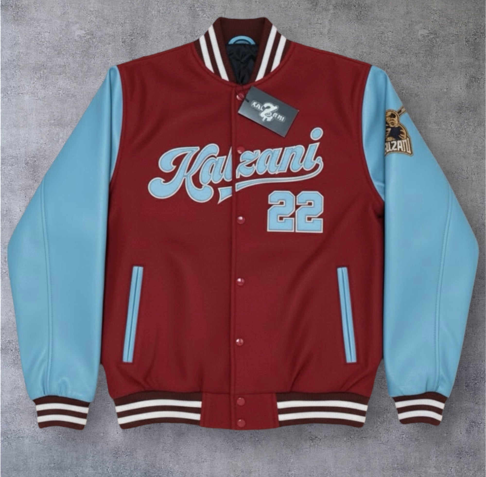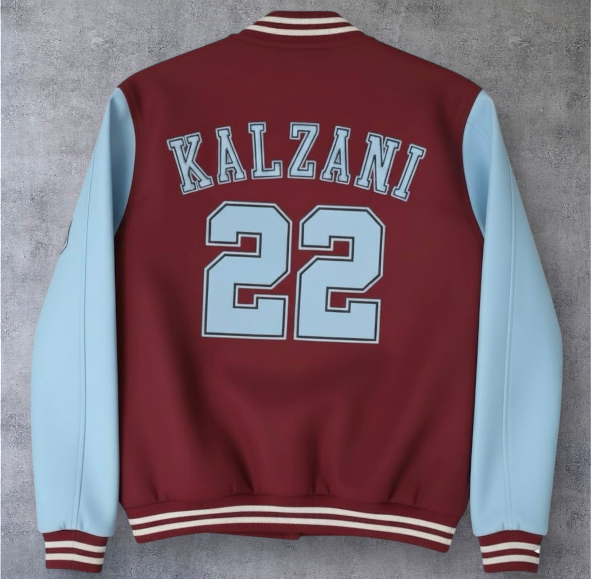 Deep red and icy blue custom Kalzani varsity bomber.